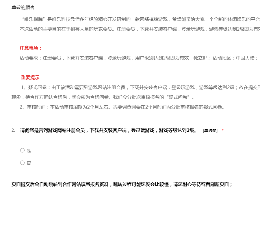 “唯乐棋牌”是唯乐科技凭借多年经验精心开发研制的一款网络棋牌游戏,希望能带给大家一个全新的休闲娱乐的平台。 本次活动的主要目的在于招募大量的玩家会员。注册会员,下载并安装客户端,登录玩游戏,游戏等级达到2级即为有效,独立IP、独立机器码。 注意事项: 活动要求:注册会员,下载并安装客户端,登录玩游戏,用户级别达到2级即为有效,独立IP; 活动地区:中国大陆; 重要提示 1、疑式问卷:由于该活动需要到游戏网站注册会员,下载并安装客户端,登录玩游戏,游戏等级达到2级;故在提交问卷后提示为“疑似问卷”,为正常现象,待合作方确认合格后,就会转为合格问卷。我们会分批次审核报名的“疑式问卷”。 2、审核时间:本活动审核周期为2个月左右。我要调查网会在2个月时间内分批审核报名的疑式问卷。
