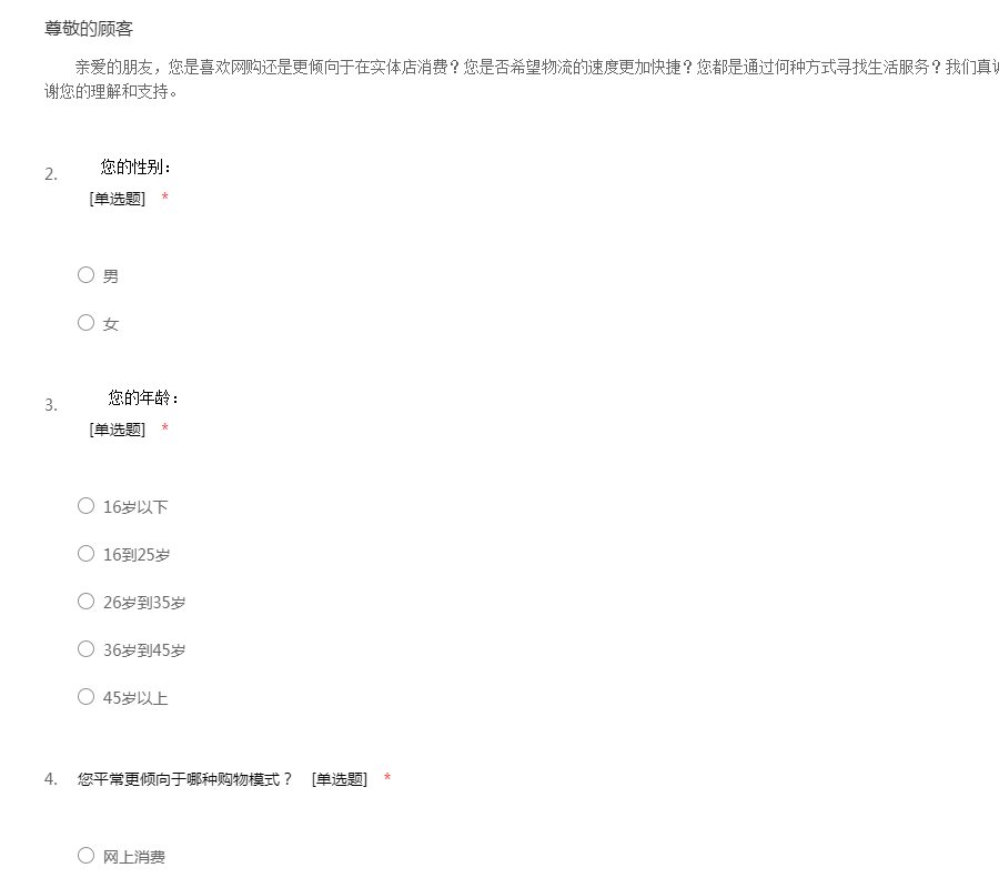亲爱的朋友,您是喜欢网购还是更倾向于在实体店消费?您是否希望物流的速度更加快捷?您都是通过何种方式寻找生活服务?我们真诚地希望您能够认真的填写这份问卷,感谢您的理解和支持。