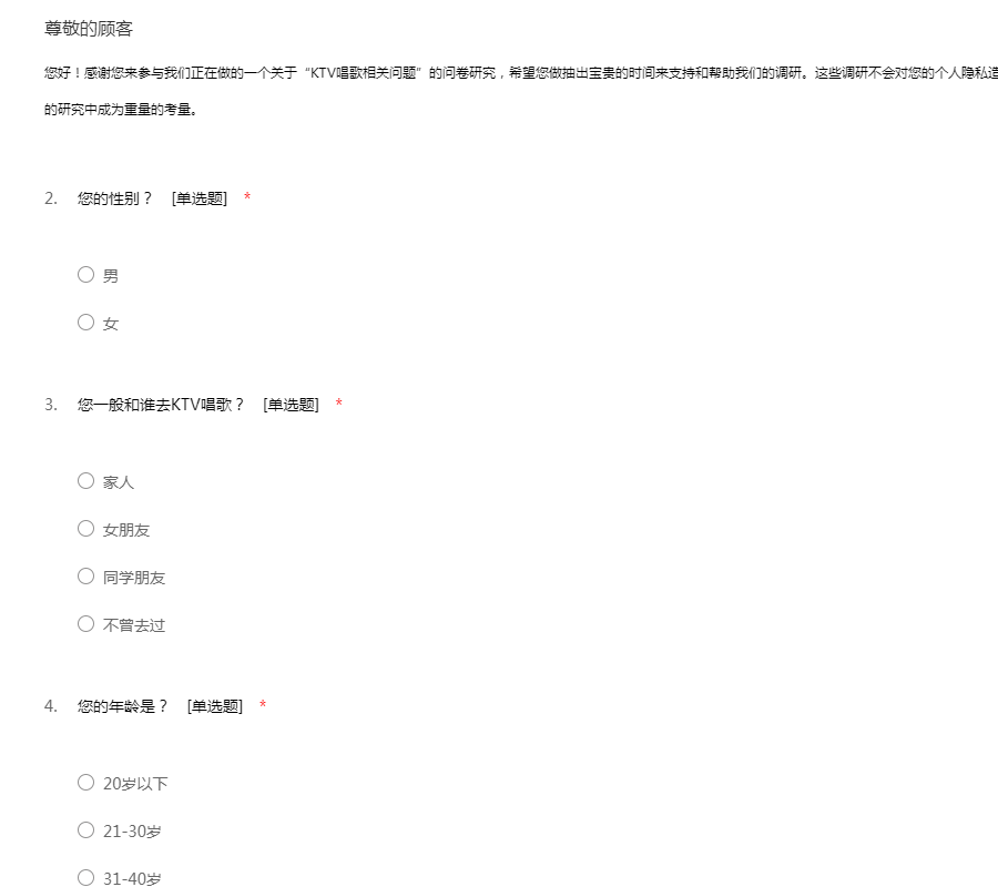 您好!感谢您来参与我们正在做的一个关于“KTV唱歌相关问题”的问卷研究,希望您做抽出宝贵的时间来支持和帮助我们的调研。这些调研不会对您的个人隐私造成任何影响,同时您的宝贵建议将会在我们未来的研究中成为重量的考量。