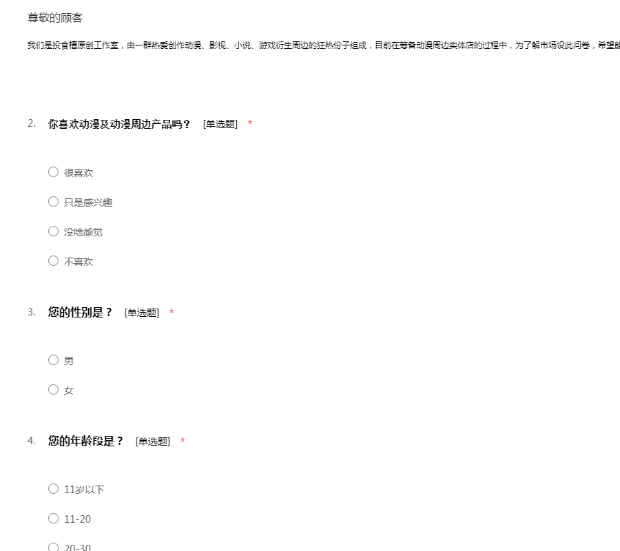 我们是投食槽原创工作室,由一群热爱创作动漫、影视、小说、游戏衍生周边的狂热份子组成,目前在筹备动漫周边实体店的过程中,为了解市场设此问卷,希望能得到您的支持,么么哒╰( ̄▽ ̄)╮