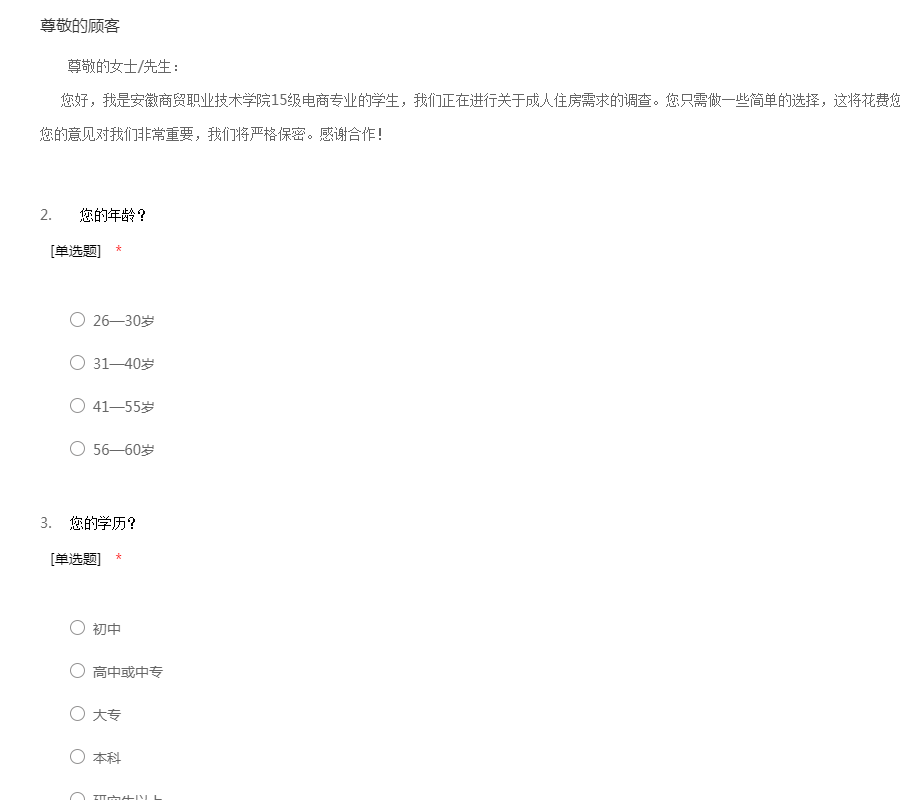 尊敬的女士/先生: 您好,我是安徽商贸职业技术学院15级电商专业的学生,我们正在进行关于成人住房需求的调查。您只需做一些简单的选择,这将花费您一两分钟的时间。此次活动与推销无关。您的意见对我们非常重要,我们将严格保密。感谢合作!