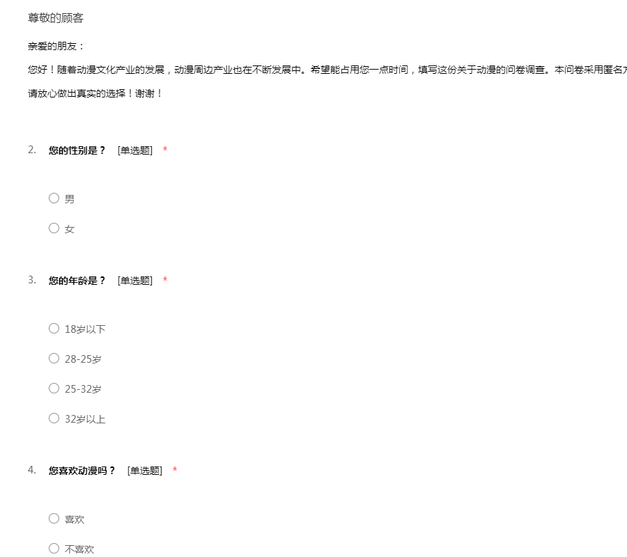 亲爱的朋友: 您好!随着动漫文化产业的发展,动漫周边产业也在不断发展中。希望能占用您一点时间,填写这份关于动漫的问卷调查。本问卷采用匿名方式,您的个人信息将会受到严格保密,请放心做出真实的选择!谢谢!