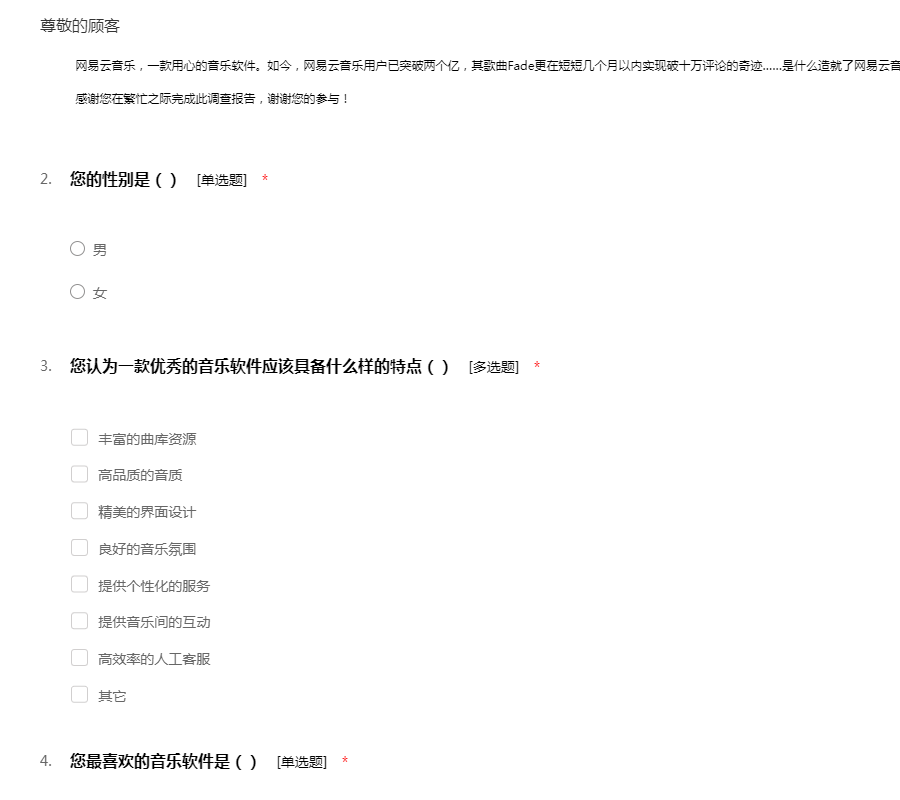 网易云音乐,一款用心的音乐软件。如今,网易云音乐用户已突破两个亿,其歌曲Fade更在短短几个月以内实现破十万评论的奇迹……是什么造就了网易云音乐的成功? 感谢您在繁忙之际完成此调查报告,谢谢您的参与!