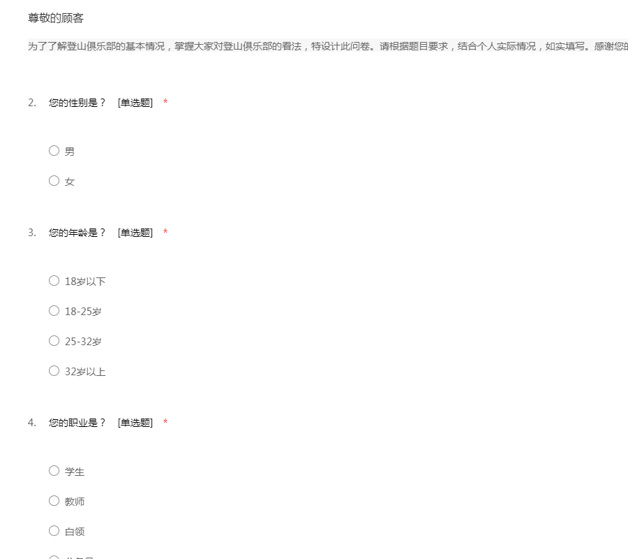 为了了解登山俱乐部的基本情况,掌握大家对登山俱乐部的看法,特设计此问卷。请根据题目要求,结合个人实际情况,如实填写。感谢您的支持与配合!
