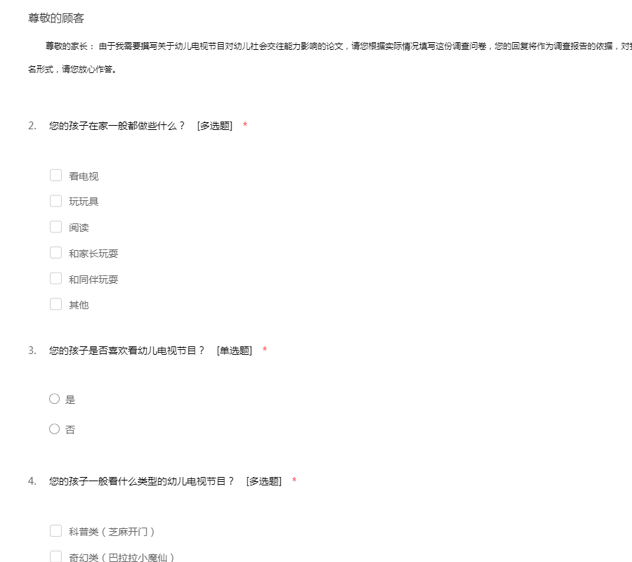 尊敬的家长: 由于我需要撰写关于幼儿电视节目对幼儿社会交往能力影响的论文,请您根据实际情况填写这份调查问卷,您的回复将作为调查报告的依据,对我的学习和工作有很大的帮助。本次问卷采用匿名形式,请您放心作答。