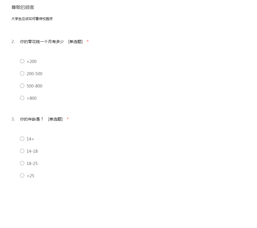 为了增加对金融业的了解、认识和看法,以便更好的学习和促进金融业的发展,我们特做进行了此次市场问卷调查。您的回答真实反映了您的看法和情况,将对我们调查有很大的帮助。同时,我们对您的回答是完全保密的。十分感谢您的参与,调查可能要耽搁您一些时间,请您谅解。谢谢您的支持和合作!