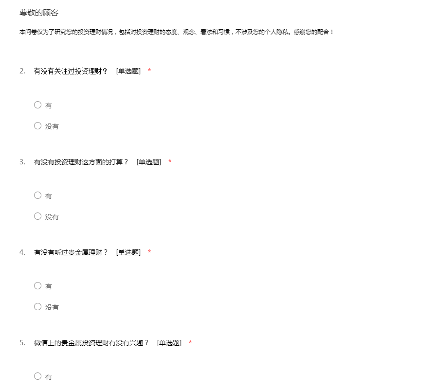 尊敬的客户,您好!为了了解银行理财产品的具体情况,我们特此制作了这份调查问卷。您的宝贵意见对我们非常重要,本问卷也是采用不记名方式,所以请放心填写。感谢您的合作!