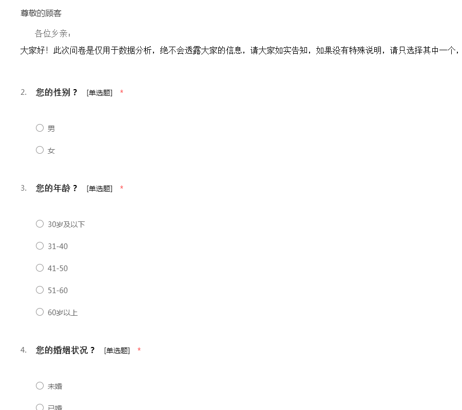 各位乡亲: 大家好!此次问卷是仅用于数据分析,绝不会透露大家的信息,请大家如实告知,如果没有特殊说明,请只选择其中一个,谢谢大家的支持和帮忙!