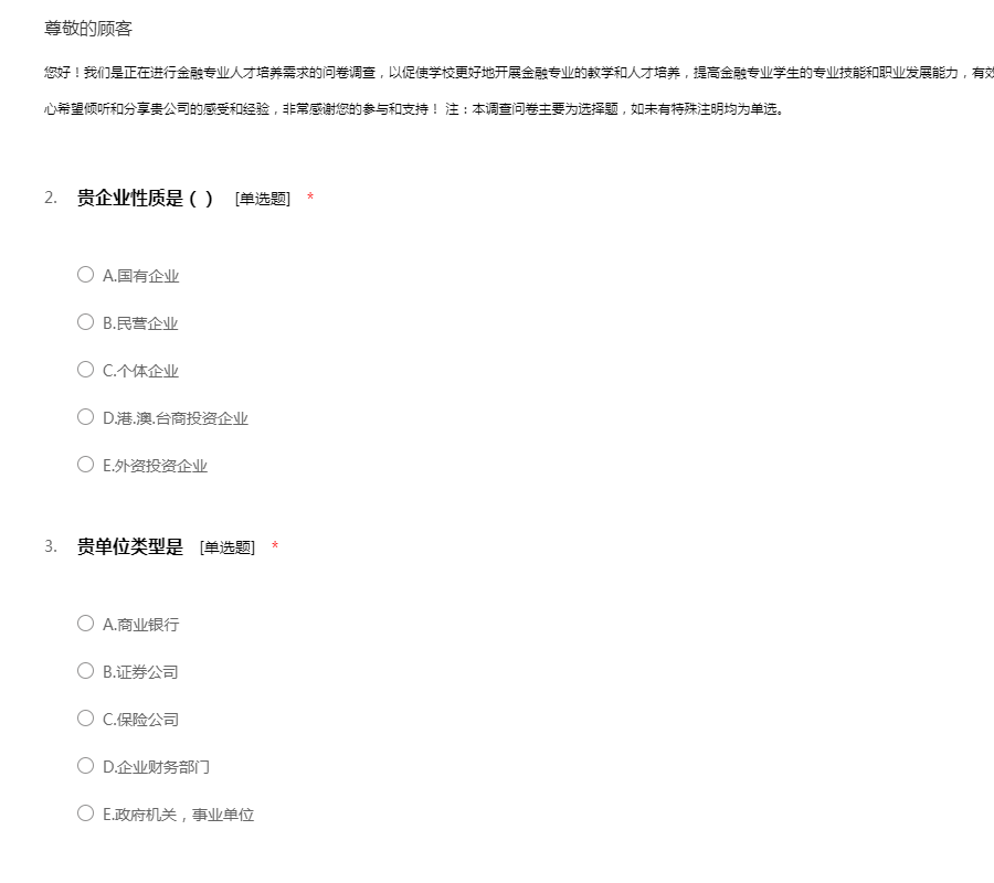您好!我们是正在进行金融专业人才培养需求的问卷调查,以促使学校更好地开展金融专业的教学和人才培养,提高金融专业学生的专业技能和职业发展能力,有效满足社会对金融专业人才的需求。因此,我们衷心希望倾听和分享贵公司的感受和经验,非常感谢您的参与和支持! 注:本调查问卷主要为选择题,如未有特殊注明均为单选。