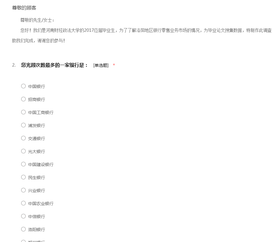 尊敬的先生/女士: 您好!我们是河南财经政法大学的2017应届毕业生,为了了解洛阳地区银行零售业务市场的情况,为毕业论文搜集数据,特制作此调查问卷,希望您能花费两分钟宝贵时间,帮助我们完成,谢谢您的参与!