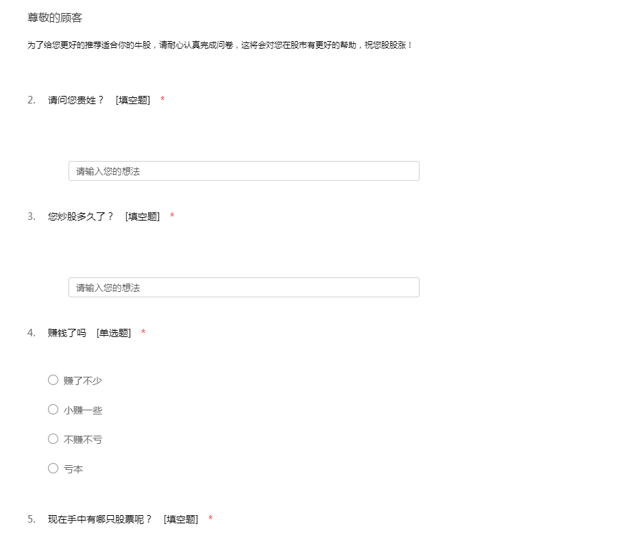 为了给您更好的推荐适合你的牛股,请耐心认真完成问卷,这将会对您在股市有更好的帮助,祝您股股涨!