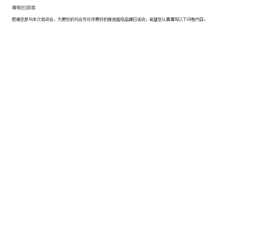 感谢您参与本次启动会,为更好的与合作伙伴更好的推进超级品牌日活动,希望您认真填写以下问卷内容。