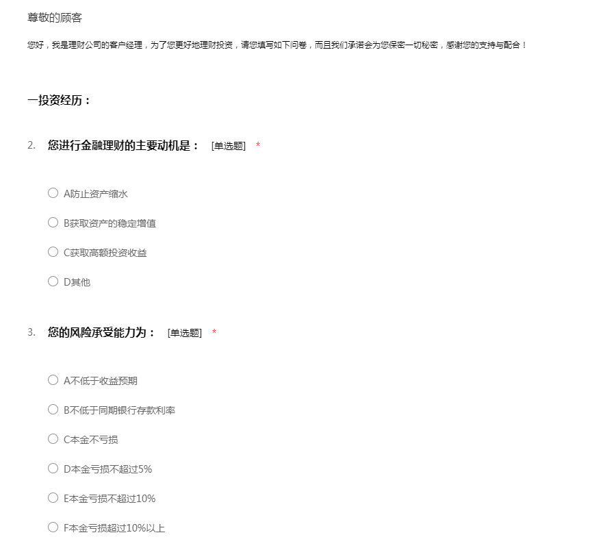 您好,我是理财公司的客户经理,为了您更好地理财投资,请您填写如下问卷,而且我们承诺会为您保密一切秘密,感谢您的支持与配合!