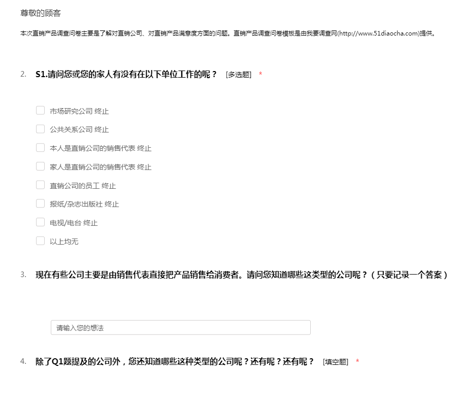 本次直销产品调查问卷主要是了解对直销公司、对直销产品满意度方面的问题。直销产品调查问卷模板是由我要调查网(http://www.51diaocha.com)提供。