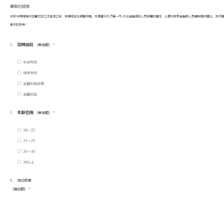 你好!非常感谢你在繁忙的工作生活之余,来填写这份调查问卷。本调查只为了解一汽-大众金融保险人员招聘的情况,以便为我司金融部人员编制提供建议。本问卷采用不记名方式,调查结果仅为本研究所用。感谢你的支持!