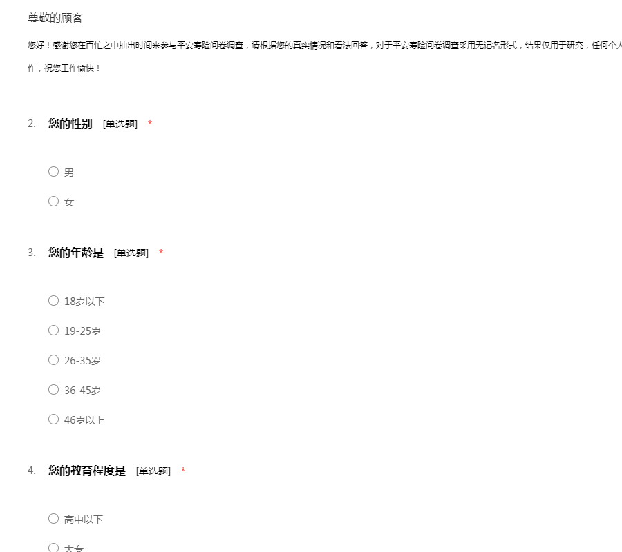 您好!感谢您在百忙之中抽出时间来参与平安寿险问卷调查,请根据您的真实情况和看法回答,对于平安寿险问卷调查采用无记名形式,结果仅用于研究,任何个人信息将绝对保密,请您放心填写。感谢您的合作,祝您工作愉快!