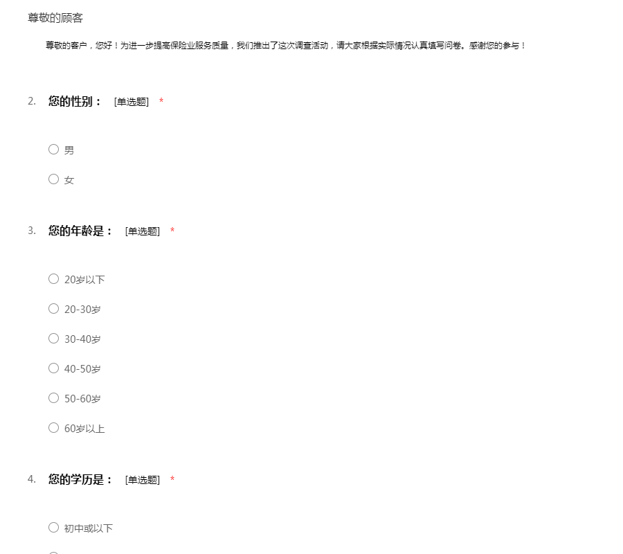 您好,为了更好地提高保险行业服务质量,我们推出保险行业调查活动,敬请大家根据个人实际情况,认真填写问卷问卷。感谢您的参与!