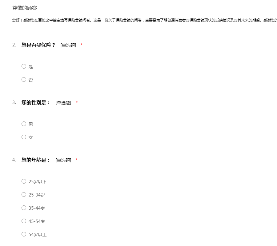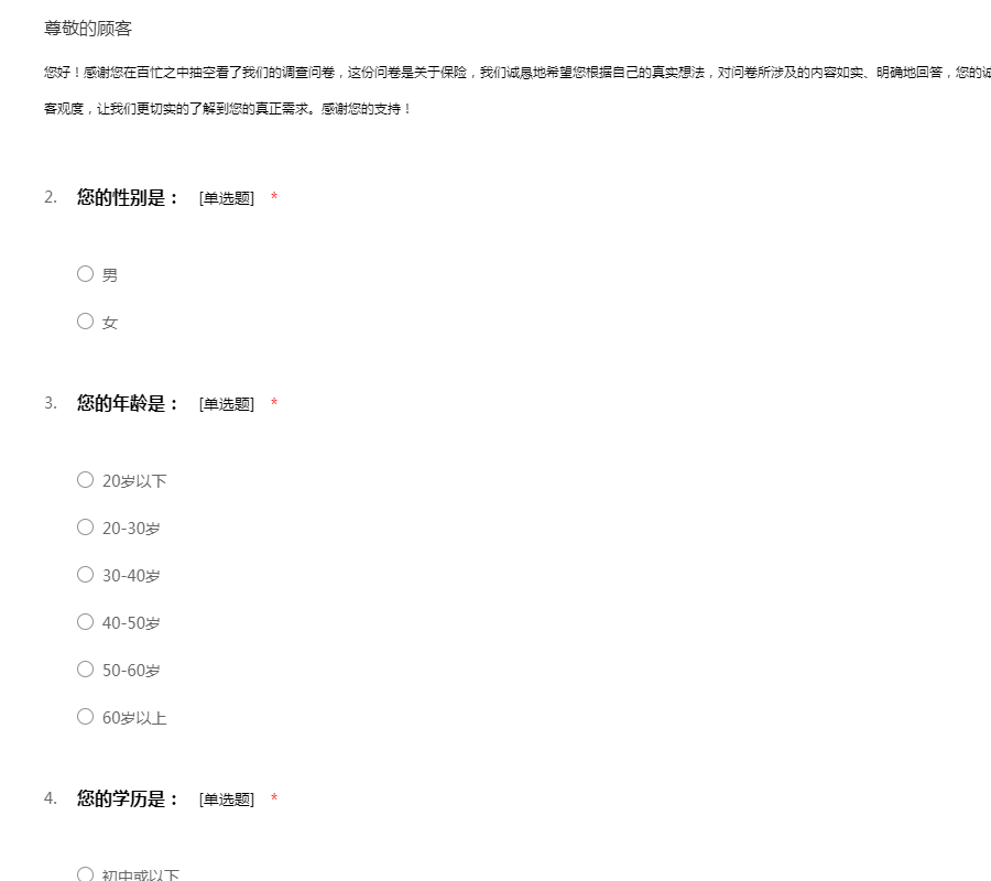 您好!感谢您在百忙之中抽空看了我们的调查问卷,这份问卷是关于保险,我们诚恳地希望您根据自己的真实想法,对问卷所涉及的内容如实、明确地回答,您的诚实回答将在很大程度上提高本次研究的可信度和客观度,让我们更切实的了解到您的真正需求。感谢您的支持!