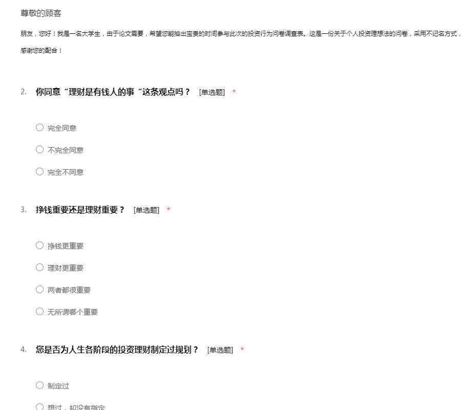 朋友,您好!我是一名大学生,由于论文需要,希望您能抽出宝贵的时间参与此次的投资行为问卷调查表。这是一份关于个人投资理想法的问卷,采用不记名方式,结果仅用于学术研究。您的回答对我非常重要,感谢您的配合!