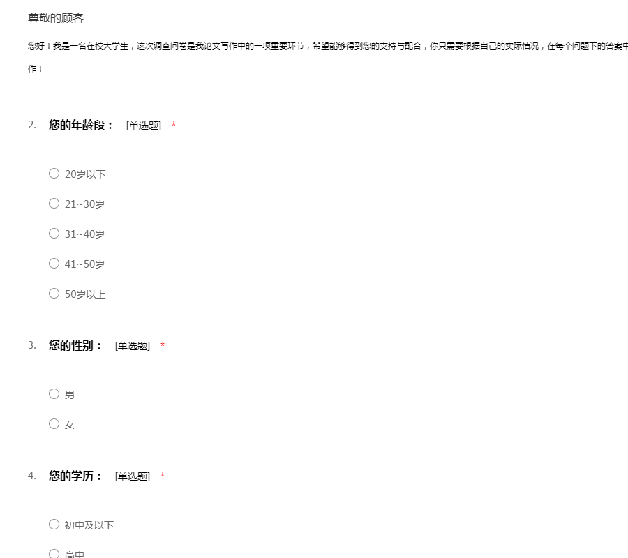 您好!我是一名在校大学生,这次调查问卷是我论文写作中的一项重要环节,希望能够得到您的支持与配合,你只需要根据自己的实际情况,在每个问题下的答案中选择与您实际情况相符合的答案。 谢谢您的合作!