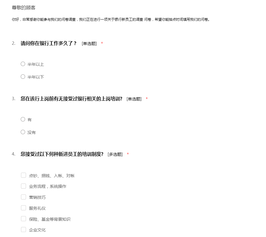 你好,非常感谢你能参与我们的问卷调查,我们正在进行一项关于银行新员工的调查 问卷,希望你能抽点时间填写我们的问卷。