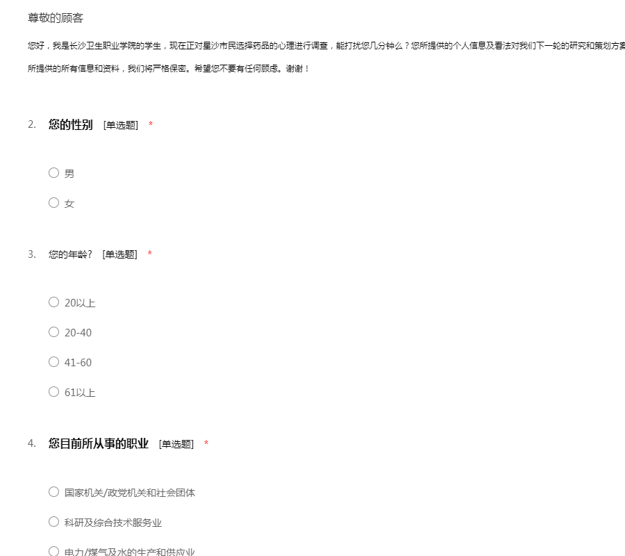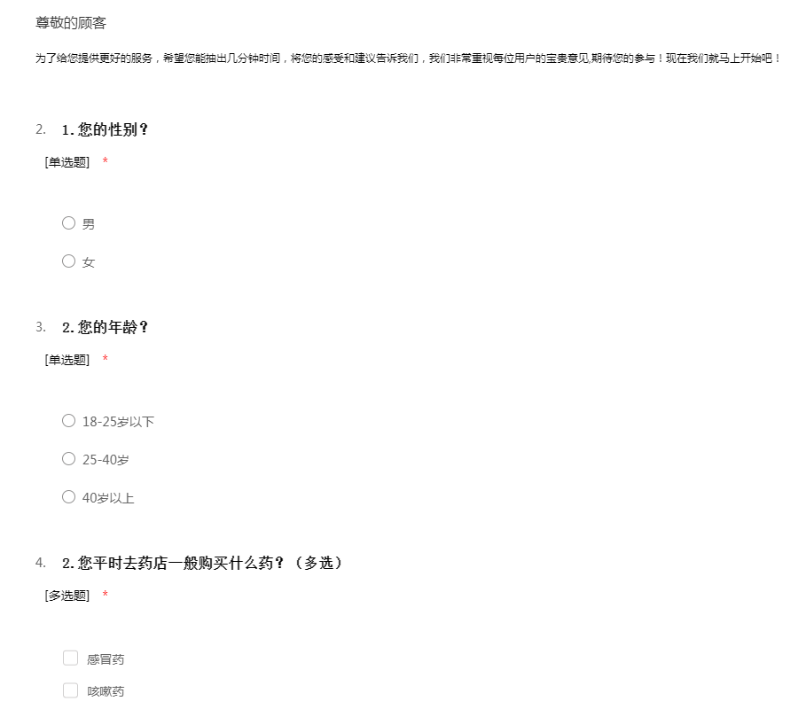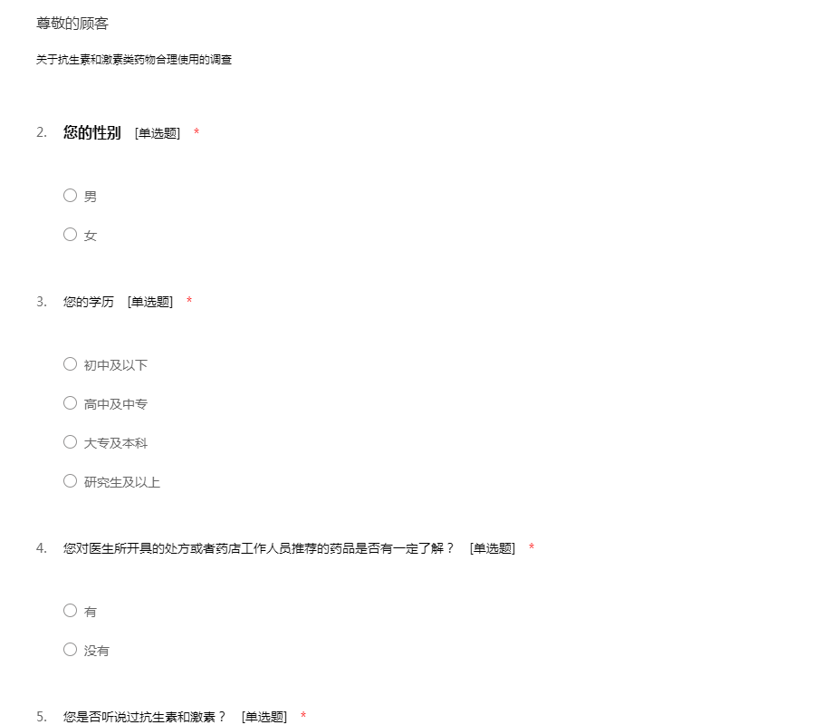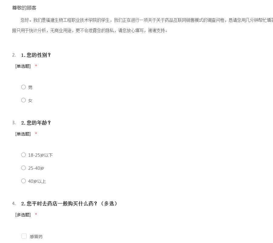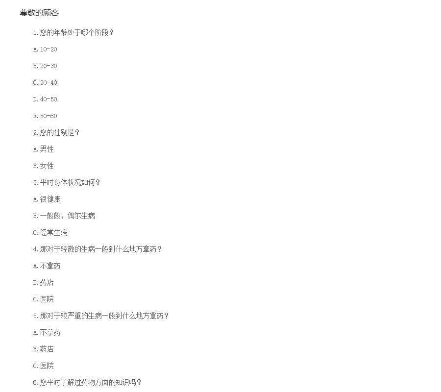 1.您的年龄处于哪个阶段?A.10-20B.20-30C.30-40D.40-50E.50-602.您的性别是?A.男性B.女性3.平时身体状况如何?A.很健康B.一般般,偶尔生病C.经常生病4.那对于轻微的生病一般到什么地方拿药?A.不拿药B.药店C.医院5.那对于较严重的生病一般到什么地方拿药?A.不拿药B.药店C.医院6.您平时了解过药物方面的知识吗?A.从来没有了解过B.偶尔看看C.经常了解7.家里一般存放的药物是哪方面的?A.完全没有B.有一些常用的感冒,清热解毒的药物C.大多数都有,比较齐全8.药物来源一般从什么地方获得呢?A.药店B.医院C.自己找草药9.现在的药物对于病情方面有效果没有?A.完全没有B.比较有效C.很有效果10.评价一下现在的医疗服务?A.非常好B.比较好C.不好非常感谢您的参与,谢谢合作,祝您生活愉快!!!