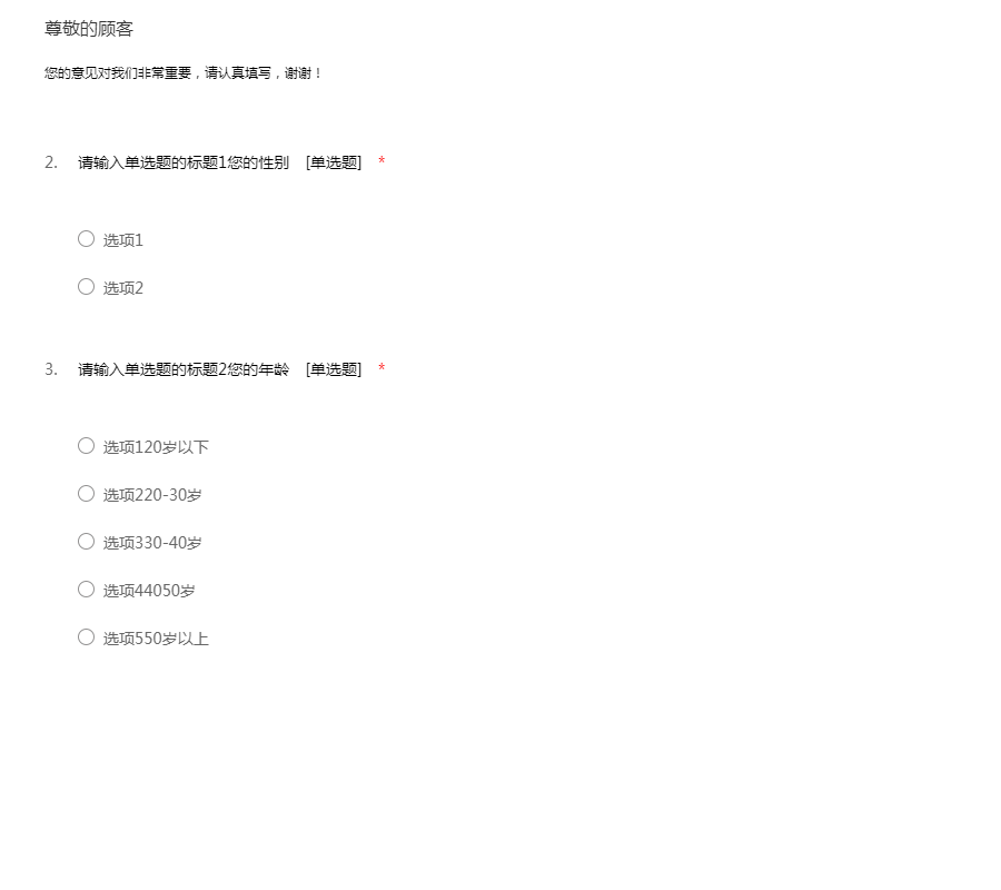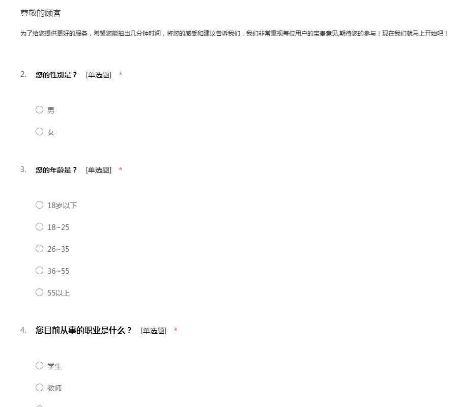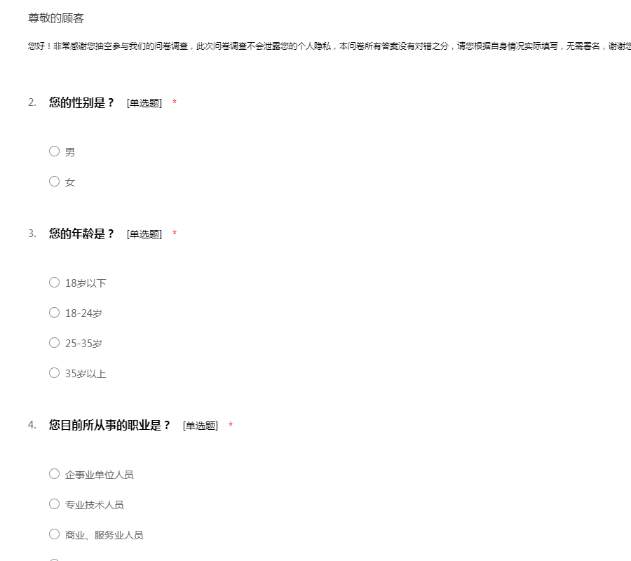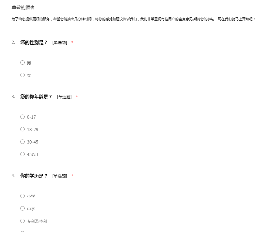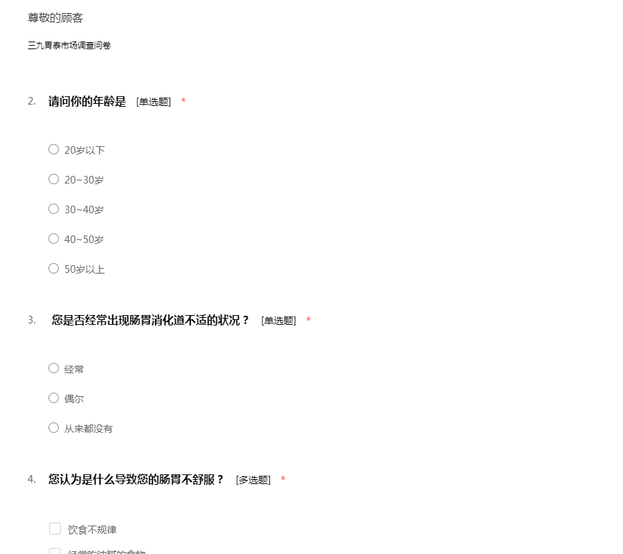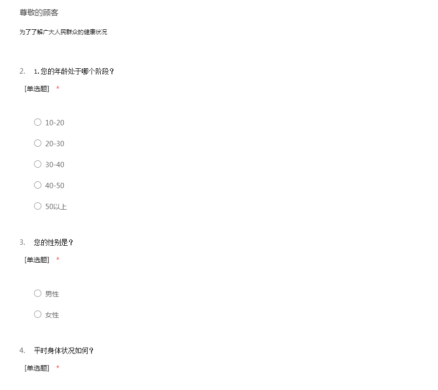 1.您的年龄处于哪个阶段?A.10-20B.20-30C.30-40D.40-50E.50-602.您的性别是?A.男性B.女性3.平时身体状况如何?A.很健康B.一般般,偶尔生病C.经常生病4.那对于轻微的生病一般到什么地方拿药?A.不拿药B.药店C.医院5.那对于较严重的生病一般到什么地方拿药?A.不拿药B.药店C.医院6.您平时了解过药物方面的知识吗?A.从来没有了解过B.偶尔看看C.经常了解7.家里一般存放的药物是哪方面的?A.完全没有B.有一些常用的感冒,清热解毒的药物C.大多数都有,比较齐全8.药物来源一般从什么地方获得呢?A.药店B.医院C.自己找草药9.现在的药物对于病情方面有效果没有?A.完全没有B.比较有效C.很有效果10.评价一下现在的医疗服务?A.非常好B.比较好C.不好非常感谢您的参与,谢谢合作,祝您生活愉快!!!