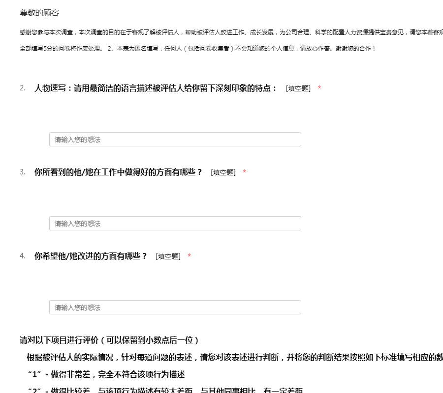 感谢您参与本次调查,本次调查的目的在于客观了解被评估人,帮助被评估人改进工作、成长发展,为公司合理、科学的配置人力资源提供宝贵意见,请您本着客观、公正的态度如实填写调查问卷。 注意: 1、全部填写5分的问卷将作废处理。 2、本表为匿名填写,任何人(包括问卷收集者)不会知道您的个人信息,请放心作答。谢谢您的合作!