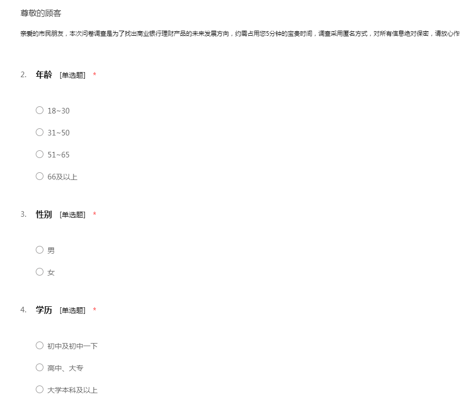 亲爱的市民朋友,本次问卷调查是为了找出商业银行理财产品的未来发展方向,约需占用您5分钟的宝贵时间,调查采用匿名方式,对所有信息绝对保密,请放心作答。非常感谢您的作答!