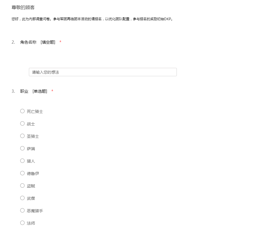 您好,此为内部调查问卷。参与军团再临团本活动的请报名,以优化团队配置,参与报名的奖励初始DKP。