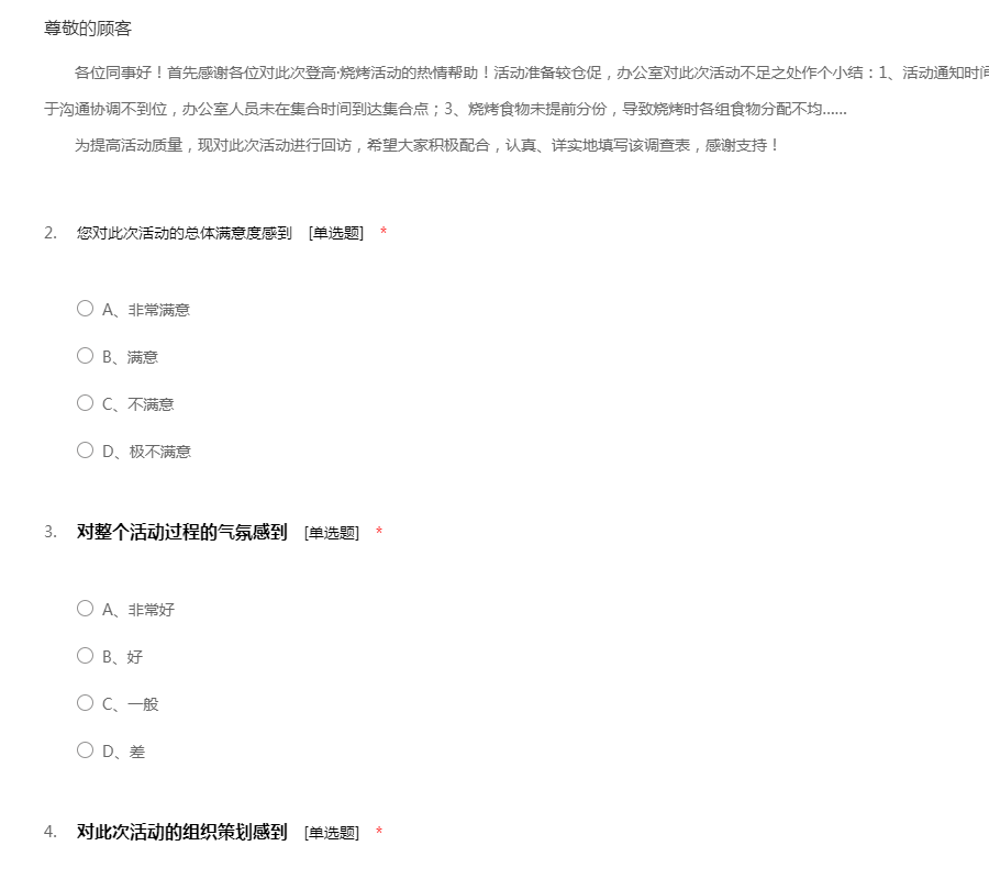 各位同事好!首先感谢各位对此次登高·烧烤活动的热情帮助!活动准备较仓促,办公室对此次活动不足之处作个小结:1、活动通知时间较晚,小组准备标志物时间有限;2、由于沟通协调不到位,办公室人员未在集合时间到达集合点;3、烧烤食物未提前分份,导致烧烤时各组食物分配不均…… 为提高活动质量,现对此次活动进行回访,希望大家积极配合,认真、详实地填写该调查表,感谢支持!