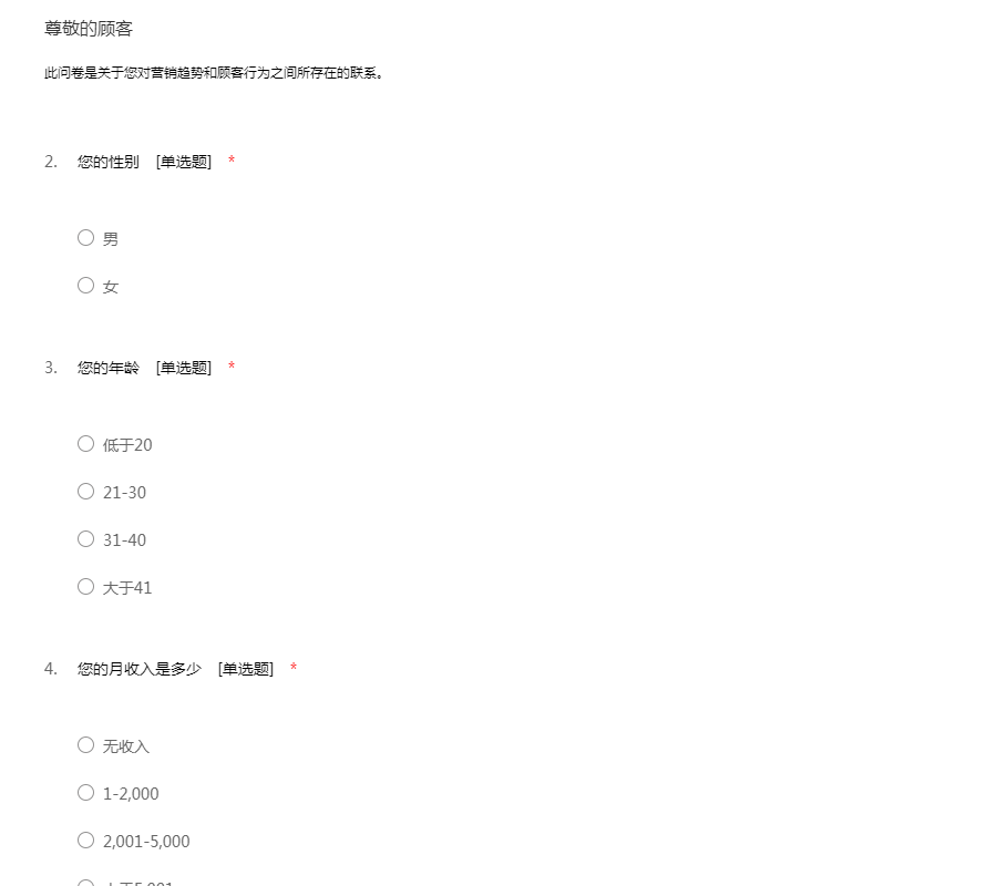 此问卷是关于您对营销趋势和顾客行为之间所存在的联系。