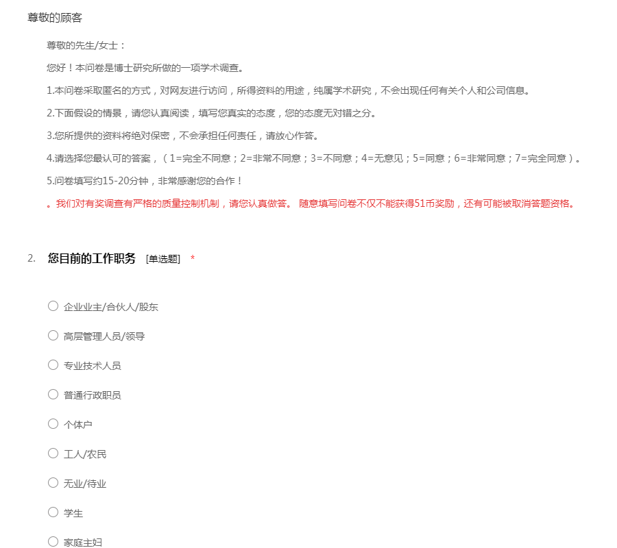 尊敬的先生/女士: 您好!本问卷是博士研究所做的一项学术调查。 1.本问卷采取匿名的方式,对网友进行访问,所得资料的用途,纯属学术研究,不会出现任何有关个人和公司信息。 2.下面假设的情景,请您认真阅读,填写您真实的态度,您的态度无对错之分。 3.您所提供的资料将绝对保密,不会承担任何责任,请放心作答。 4.请选择您最认可的答案,(1=完全不同意;2=非常不同意;3=不同意;4=无意见;5=同意;6=非常同意;7=完全同意)。 5.问卷填写约15-20分钟,非常感谢您的合作! 。我们对有奖调查有严格的质量控制机制,请您认真做答。 随意填写问卷不仅不能获得51币奖励,还有可能被取消答题资格。