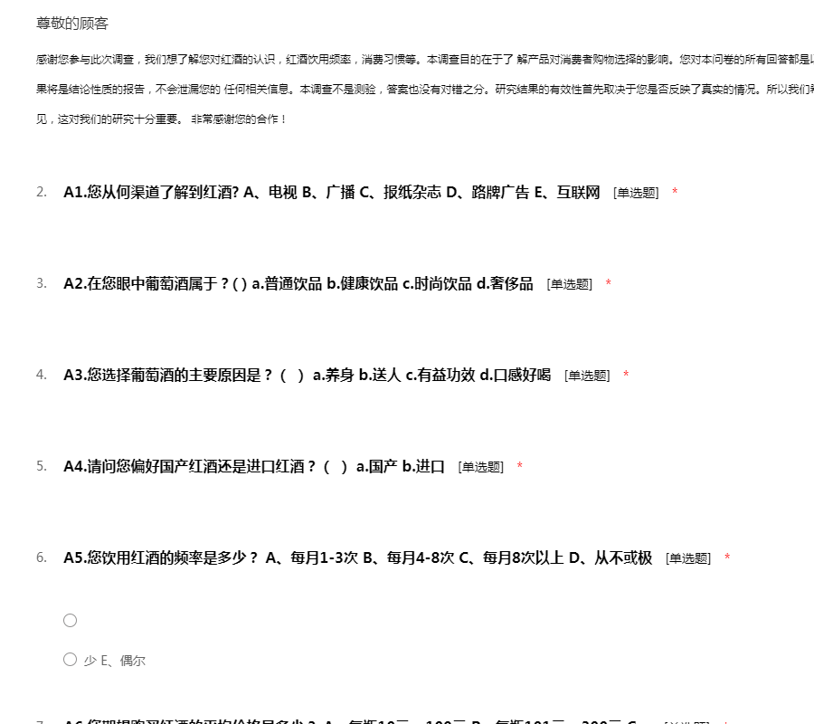 感谢您参与此次调查,我们想了解您对红酒的认识,红酒饮用频率,消费习惯等。本调查目的在于了 解产品对消费者购物选择的影响。您对本问卷的所有回答都是以匿名形式进行并且答案得到严格保密,研究结果将是结论性质的报告,不会泄漏您的 任何相关信息。本调查不是测验,答案也没有对错之分。研究结果的有效性首先取决于您是否反映了真实的情况。所以我们希望您对每一个问题都非常认真地表达自己的意见,这对我们的研究十分重要。 非常感谢您的合作!
