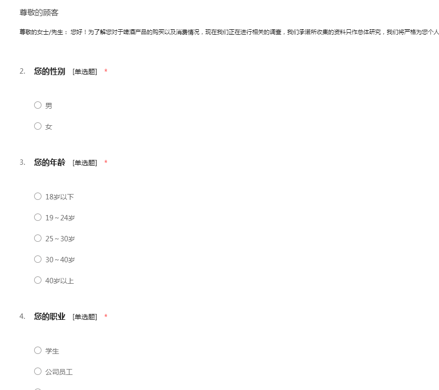 尊敬的女士/先生: 您好!为了解您对于啤酒产品的购买以及消费情况,现在我们正在进行相关的调查,我们承诺所收集的资料只作总体研究,我们将严格为您个人情况保密,谢谢您的合作!