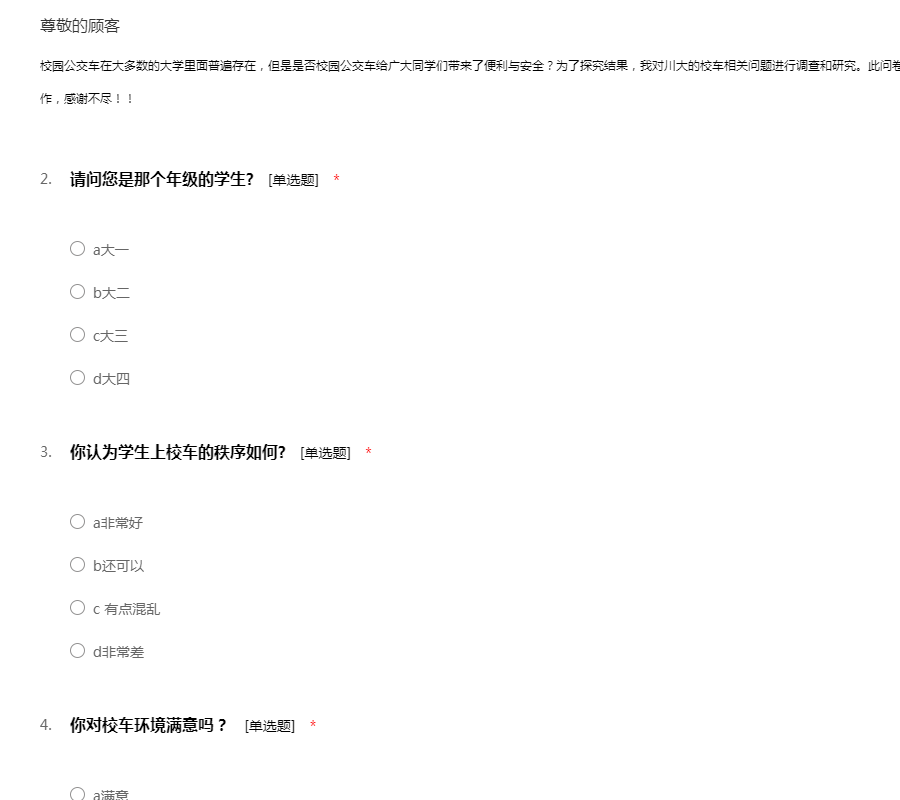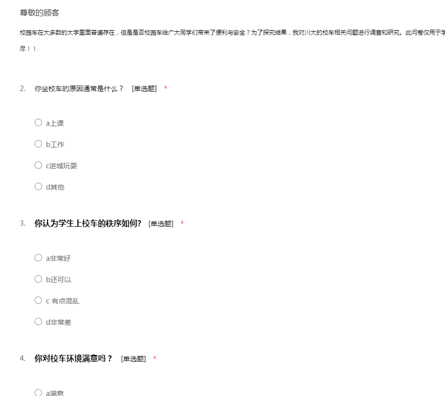 校园车在大多数的大学里面普遍存在,但是是否校园车给广大同学们带来了便利与安全?为了探究结果,我对川大的校车相关问题进行调查和研究。此问卷仅用于学术,请您不必顾虑。真诚感谢您的合作,感谢不尽!!