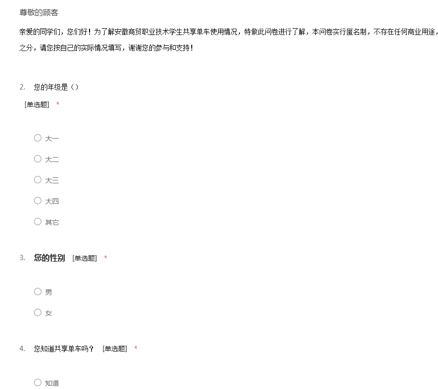 亲爱的同学们,您们好!为了解安徽商贸职业技术学生共享单车使用情况,特做此问卷进行了解,本问卷实行匿名制,不存在任何商业用途,更不会泄露您的任何隐私。题目无对错之分,请您按自己的实际情况填写,谢谢您的参与和支持!