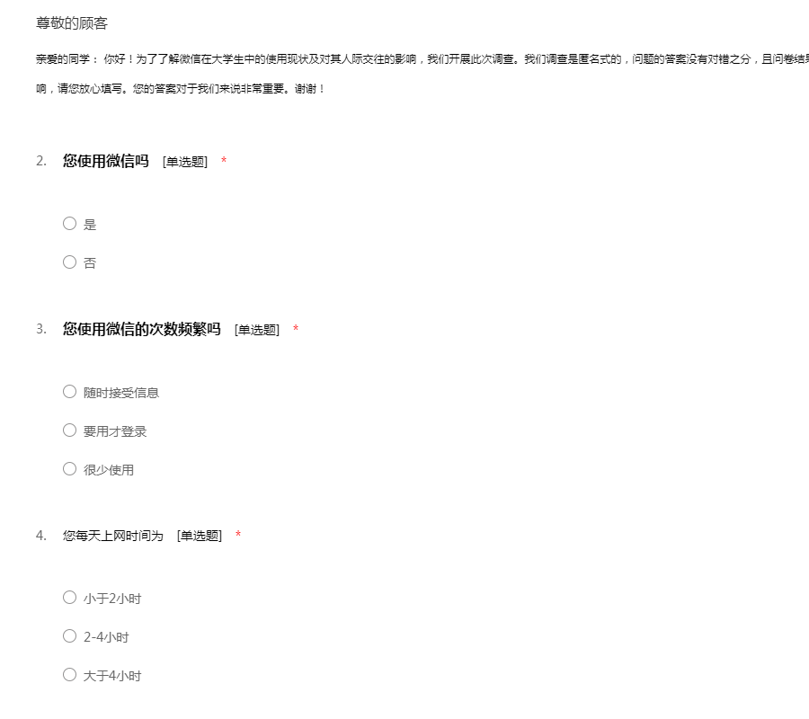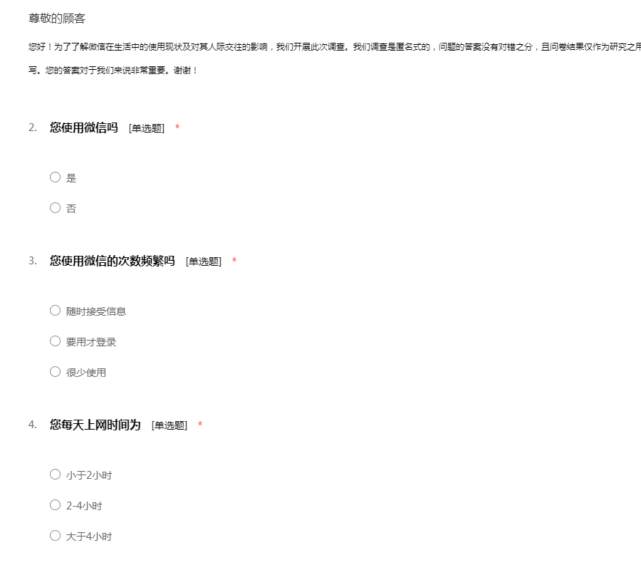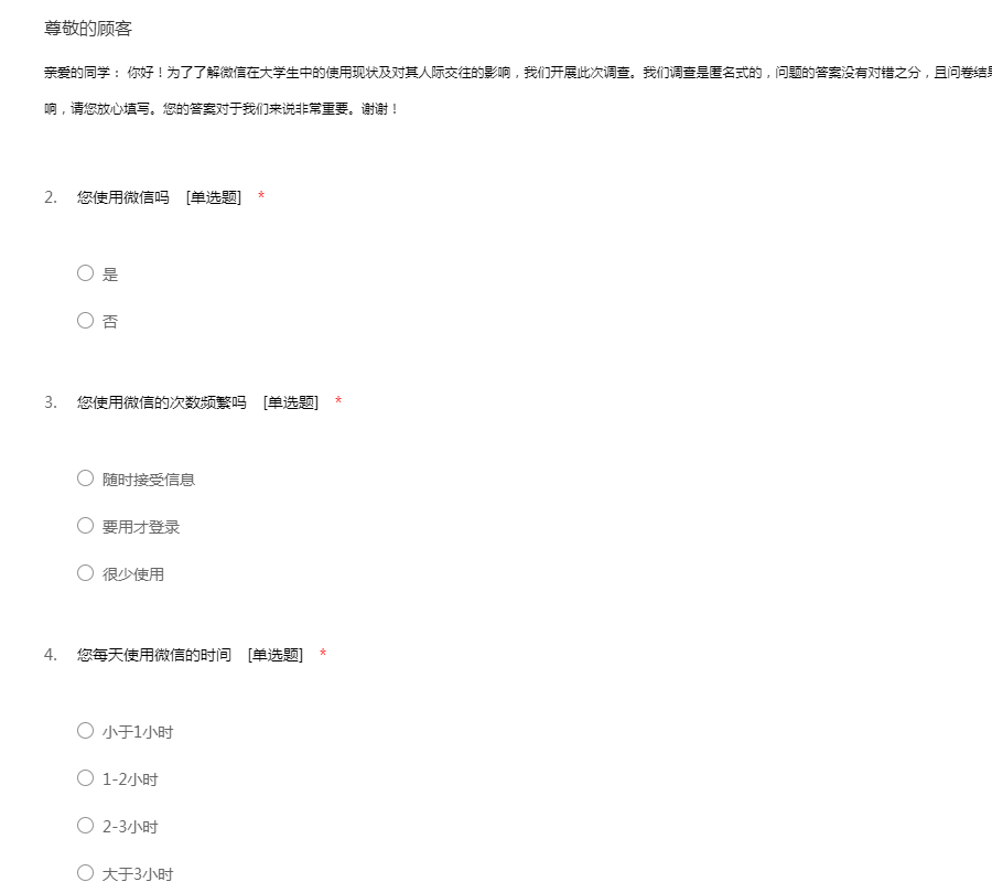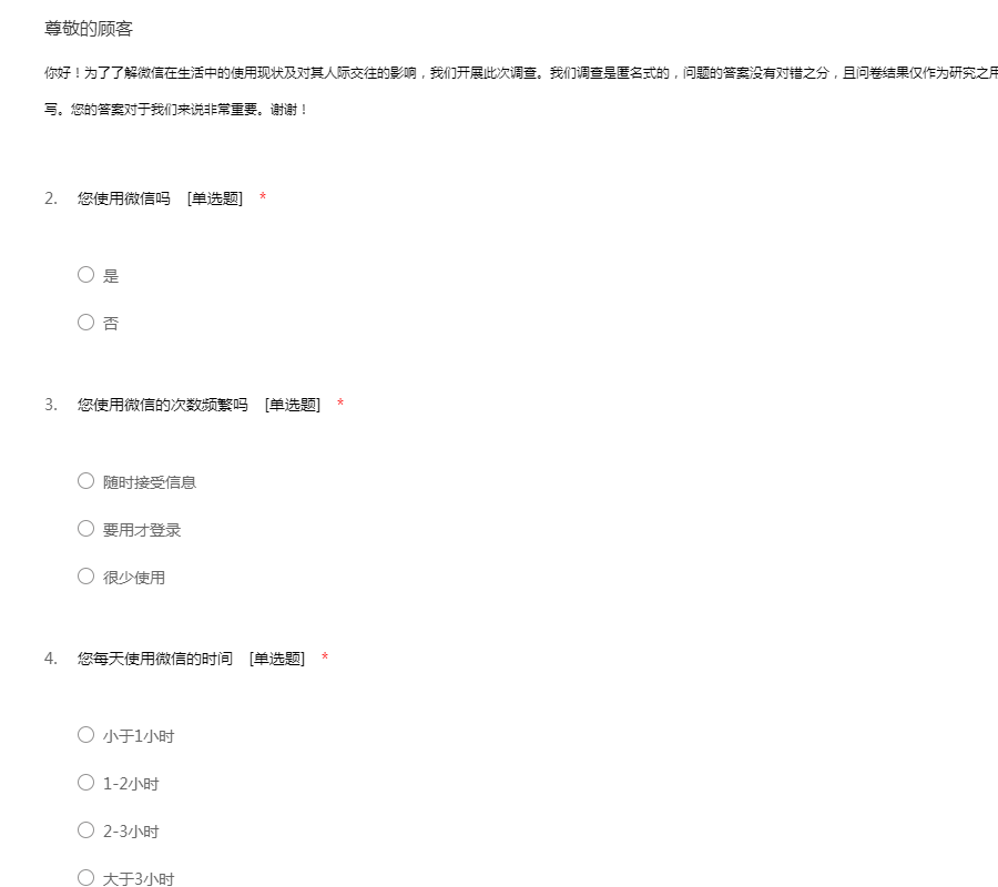 你好!为了了解微信在生活中的使用现状及对其人际交往的影响,我们开展此次调查。我们调查是匿名式的,问题的答案没有对错之分,且问卷结果仅作为研究之用,不会对您的个人隐私造成影响,请您放心填写。您的答案对于我们来说非常重要。谢谢!