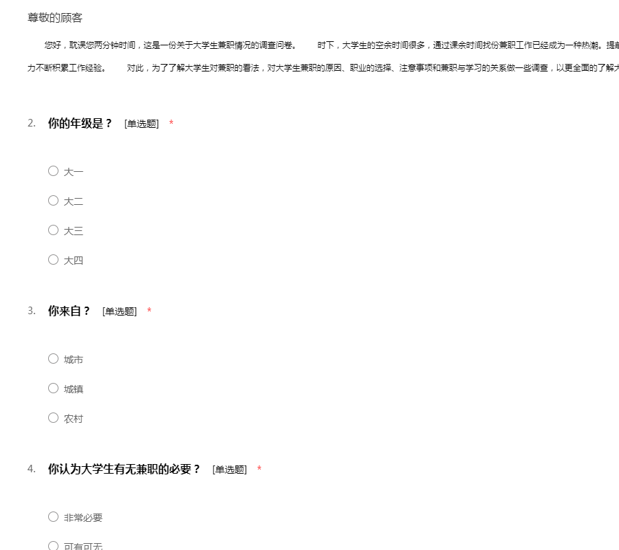 您好,耽误您两分钟时间,这是一份关于大学生兼职情况的调查问卷。 时下,大学生的空余时间很多,通过课余时间找份兼职工作已经成为一种热潮。提前接触社会,在学理论知识的同时增强社会实践能力不断积累工作经验。 对此,为了了解大学生对兼职的看法,对大学生兼职的原因、职业的选择、注意事项和兼职与学习的关系做一些调查,以更全面的了解大学生兼职这一现象。 十分感谢您的合作!