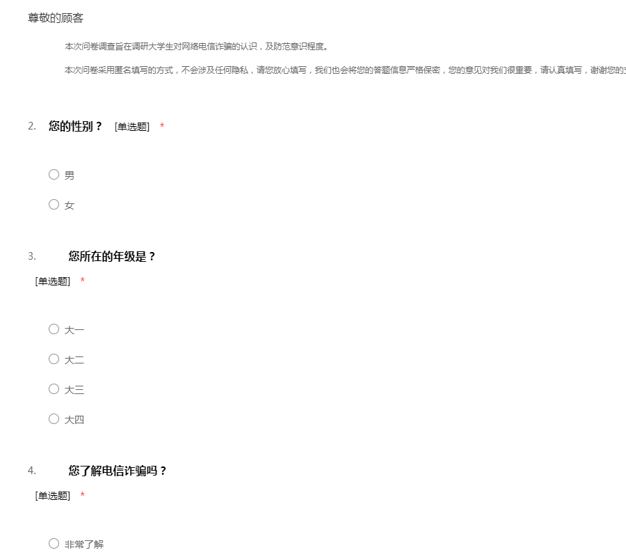 本次问卷调查旨在调研大学生对网络电信诈骗的认识,及防范意识程度。 本次问卷采用匿名填写的方式,不会涉及任何隐私,请您放心填写,我们也会将您的答题信息严格保密,您的意见对我们很重要,请认真填写,谢谢您的支持和配合!