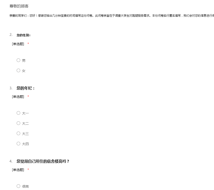 亲爱的同学们:您好!感谢您抽出几分钟宝贵的时间填写这份问卷。此问卷宗旨在于调查大学生对跑腿服务需求。本份问卷实行匿名填写,我们会对您的信息进行保密,再次感谢您的填写,谢谢!