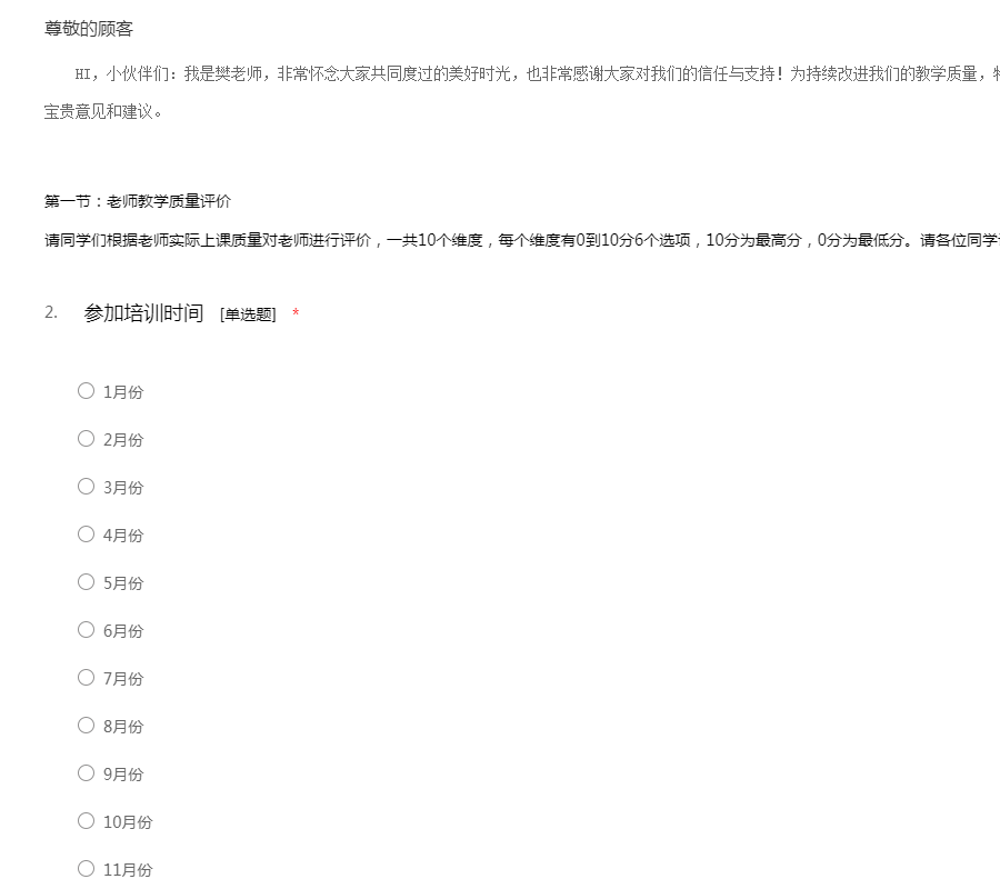 HI,小伙伴们:我是樊老师,非常怀念大家共同度过的美好时光,也非常感谢大家对我们的信任与支持!为持续改进我们的教学质量,特请你对本次培训班的教学质量提出您的宝贵意见和建议。