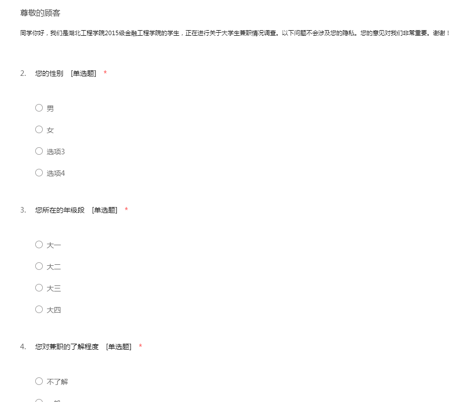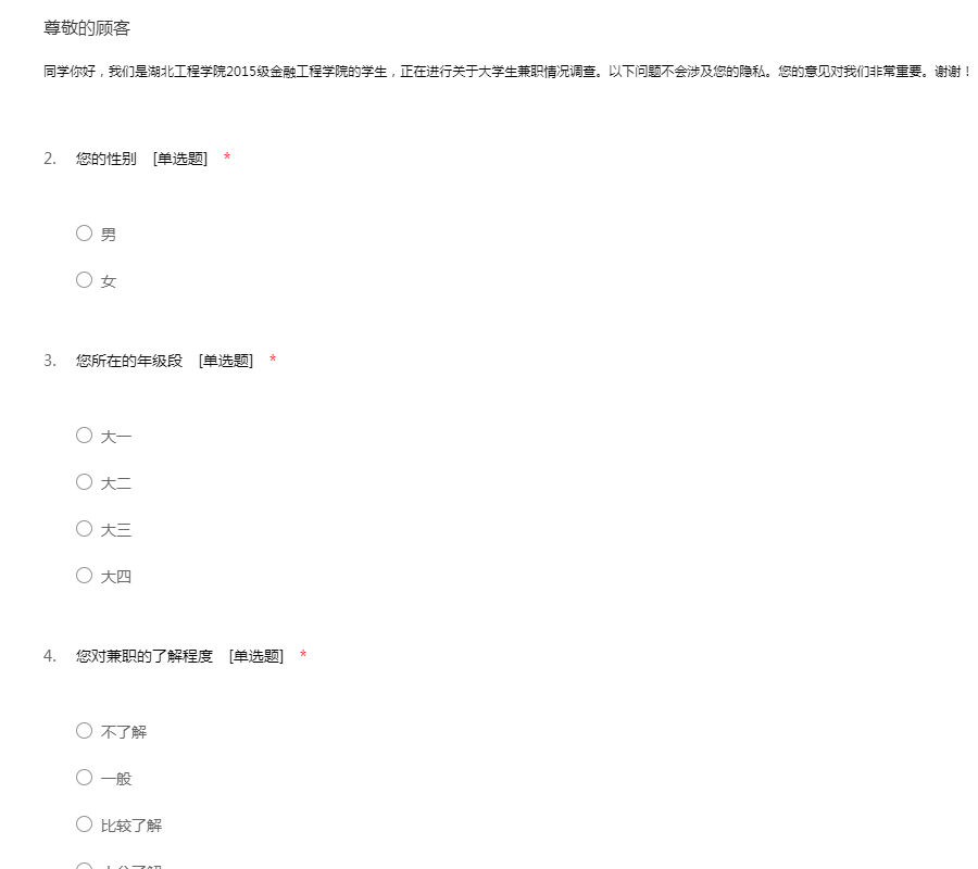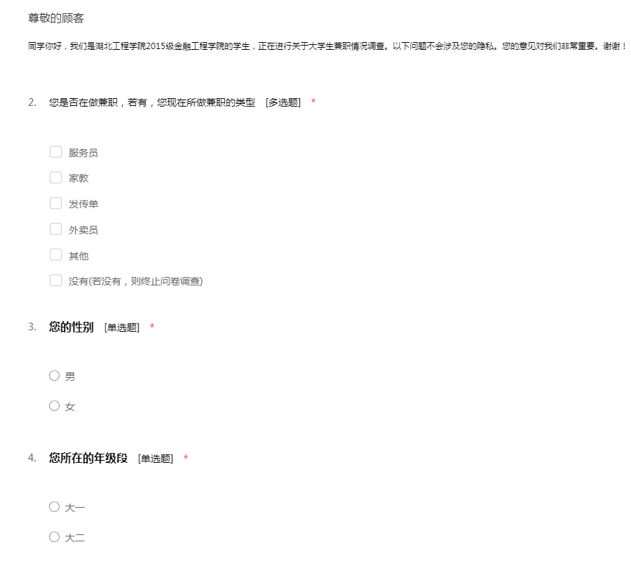 同学你好,我们是湖北工程学院2015级金融工程学院的学生,正在进行关于大学生兼职情况调查。以下问题不会涉及您的隐私。您的意见对我们非常重要。谢谢!