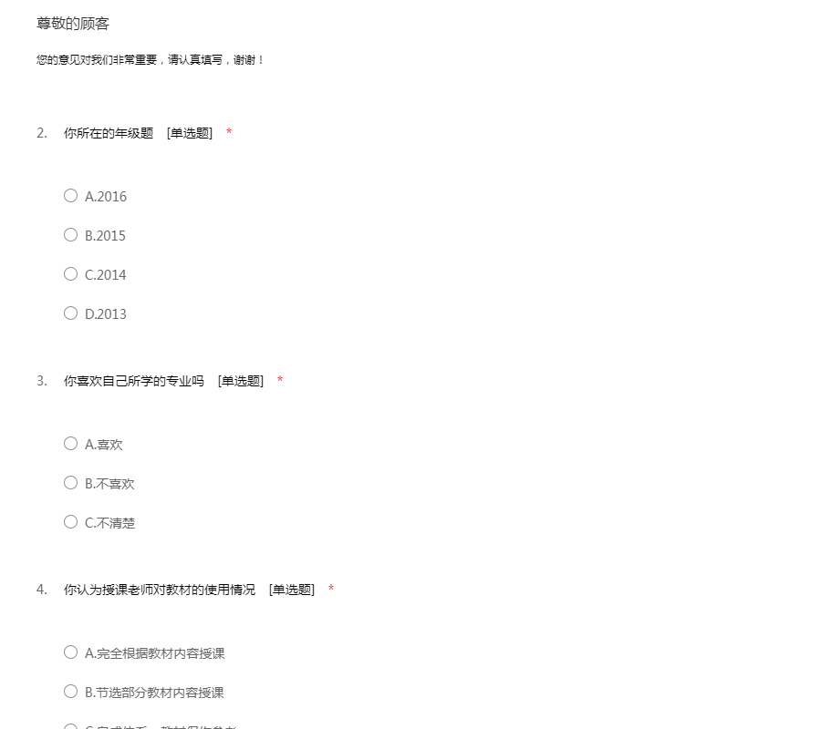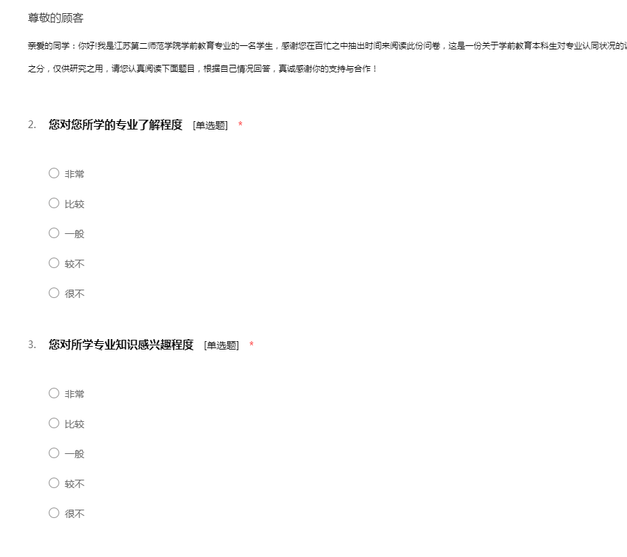 亲爱的同学:你好!我是江苏第二师范学院学前教育专业的一名学生,感谢您在百忙之中抽出时间来阅读此份问卷,这是一份关于学前教育本科生对专业认同状况的调查问卷。本问卷采取无记名方式,答案无对错之分,仅供研究之用,请您认真阅读下面题目,根据自己情况回答,真诚感谢你的支持与合作!