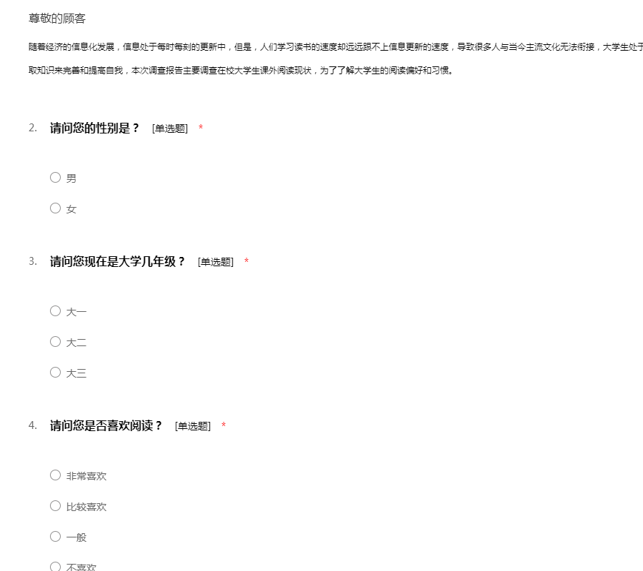 随着经济的信息化发展,信息处于每时每刻的更新中,但是,人们学习读书的速度却远远跟不上信息更新的速度,导致很多人与当今主流文化无法衔接,大学生处于一个信息化的社会,更多的需要靠多读书,多吸取知识来完善和提高自我,本次调查报告主要调查在校大学生课外阅读现状,为了了解大学生的阅读偏好和习惯。