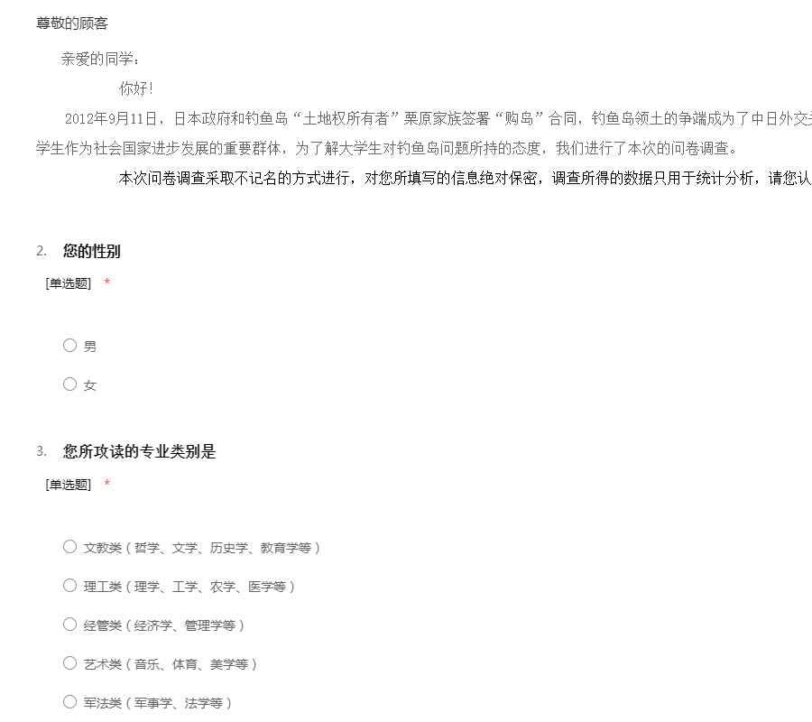 亲爱的同学: 你好! 2012年9月11日,日本政府和钓鱼岛“土地权所有者”栗原家族签署“购岛”合同,钓鱼岛领土的争端成为了中日外交关系中最为敏感的一个问题。当代大学生作为社会国家进步发展的重要群体,为了解大学生对钓鱼岛问题所持的态度,我们进行了本次的问卷调查。 本次问卷调查采取不记名的方式进行,对您所填写的信息绝对保密,调查所得的数据只用于统计分析,请您认真填写,谢谢您的合作~