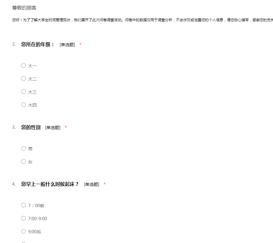 您好!为了了解大学生时间管理现状,我们展开了此次问卷调查活动。问卷中的数据仅用于调查分析,不会涉及或泄露您的个人信息,请您放心填写,感谢您的支持与配合!