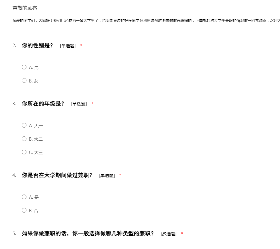 亲爱的同学们,大家好!我们已经成为一名大学生了,也听闻身边的好多同学会利用课余时间去做做兼职啥的,下面就针对大学生兼职的情况做一问卷调查,欢迎大家填写哦!