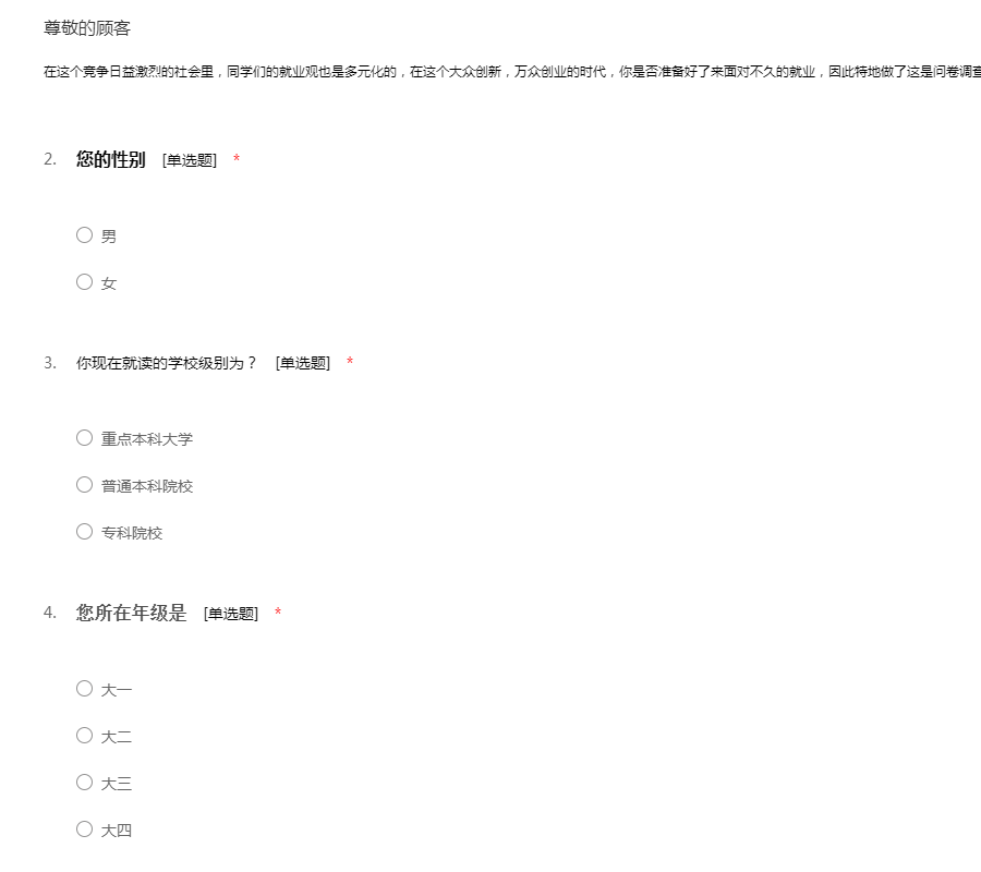 在这个竞争日益激烈的社会里,同学们的就业观也是多元化的,在这个大众创新,万众创业的时代,你是否准备好了来面对不久的就业,因此特地做了这是问卷调查。