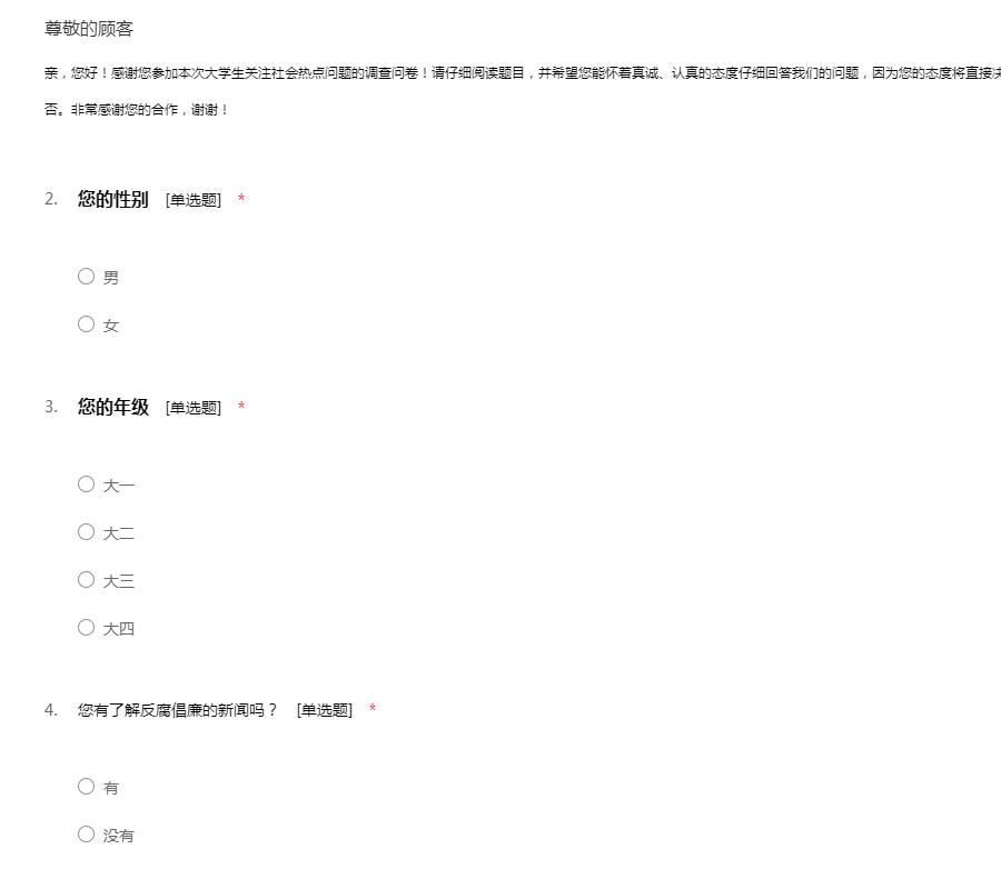 亲,您好!感谢您参加本次大学生关注社会热点问题的调查问卷!请仔细阅读题目,并希望您能怀着真诚、认真的态度仔细回答我们的问题,因为您的态度将直接决定本次调查的真实性,也将决定本次调查成功与否。非常感谢您的合作,谢谢!